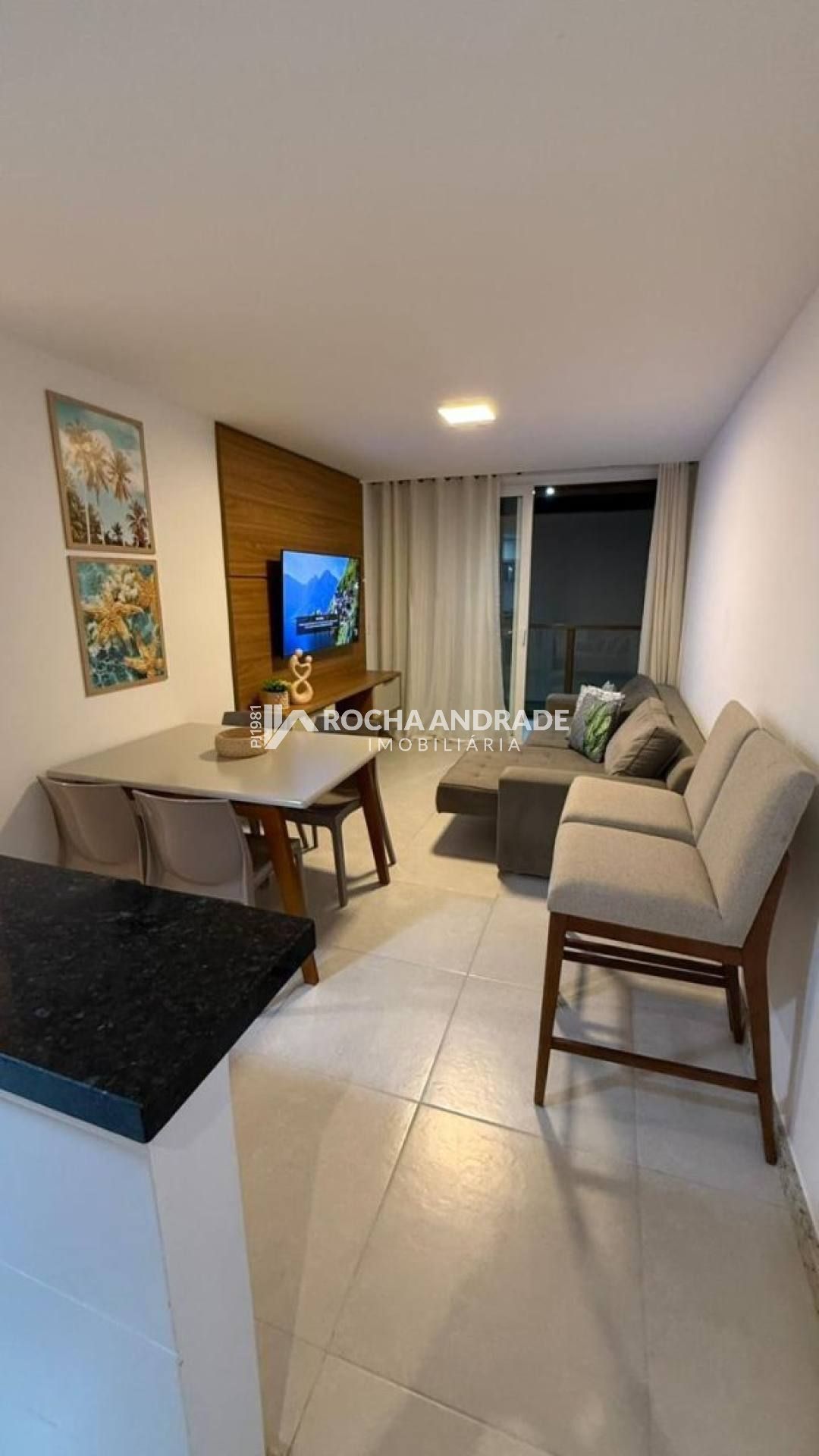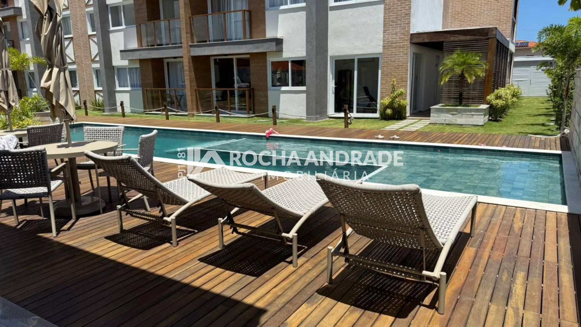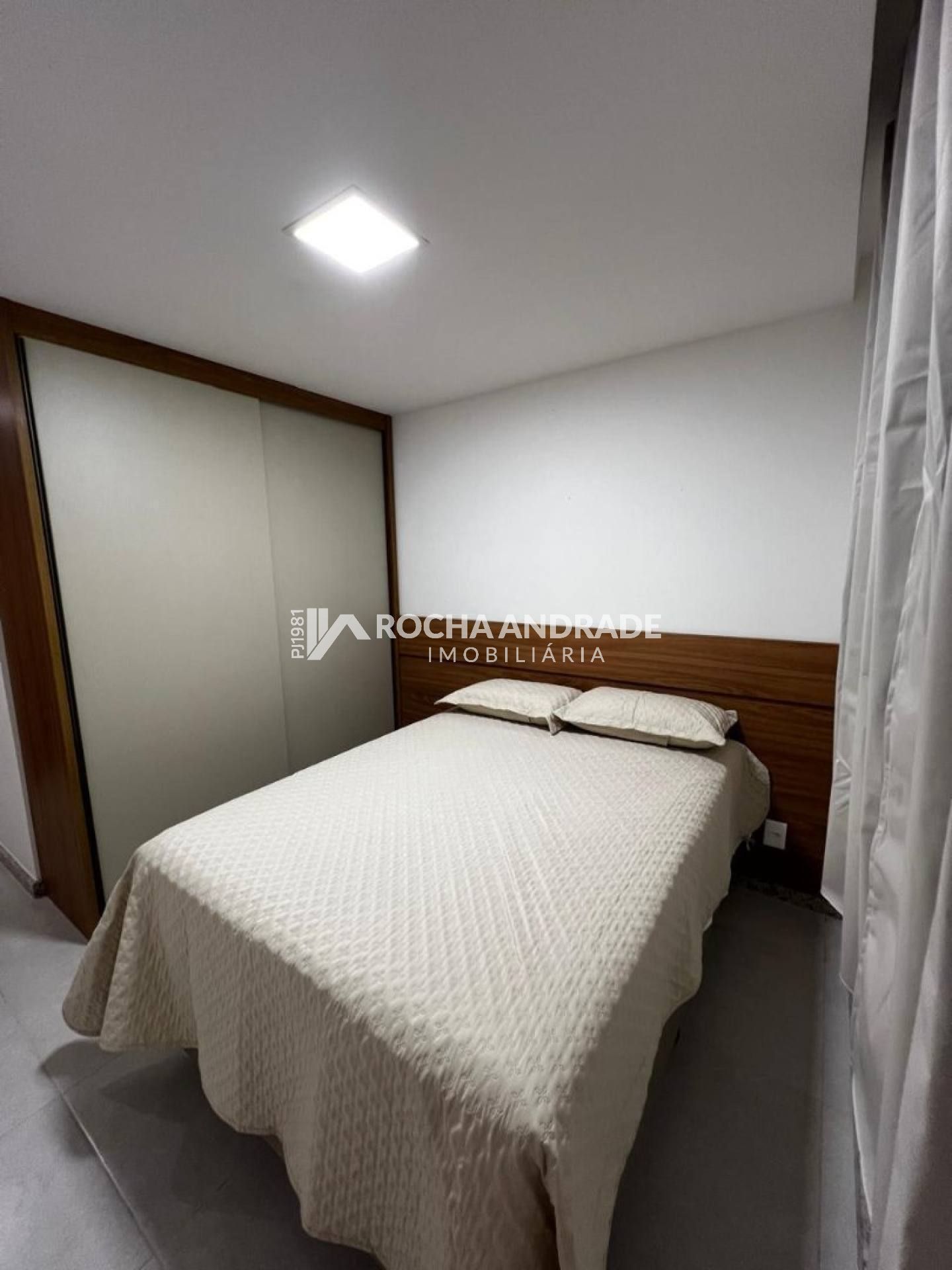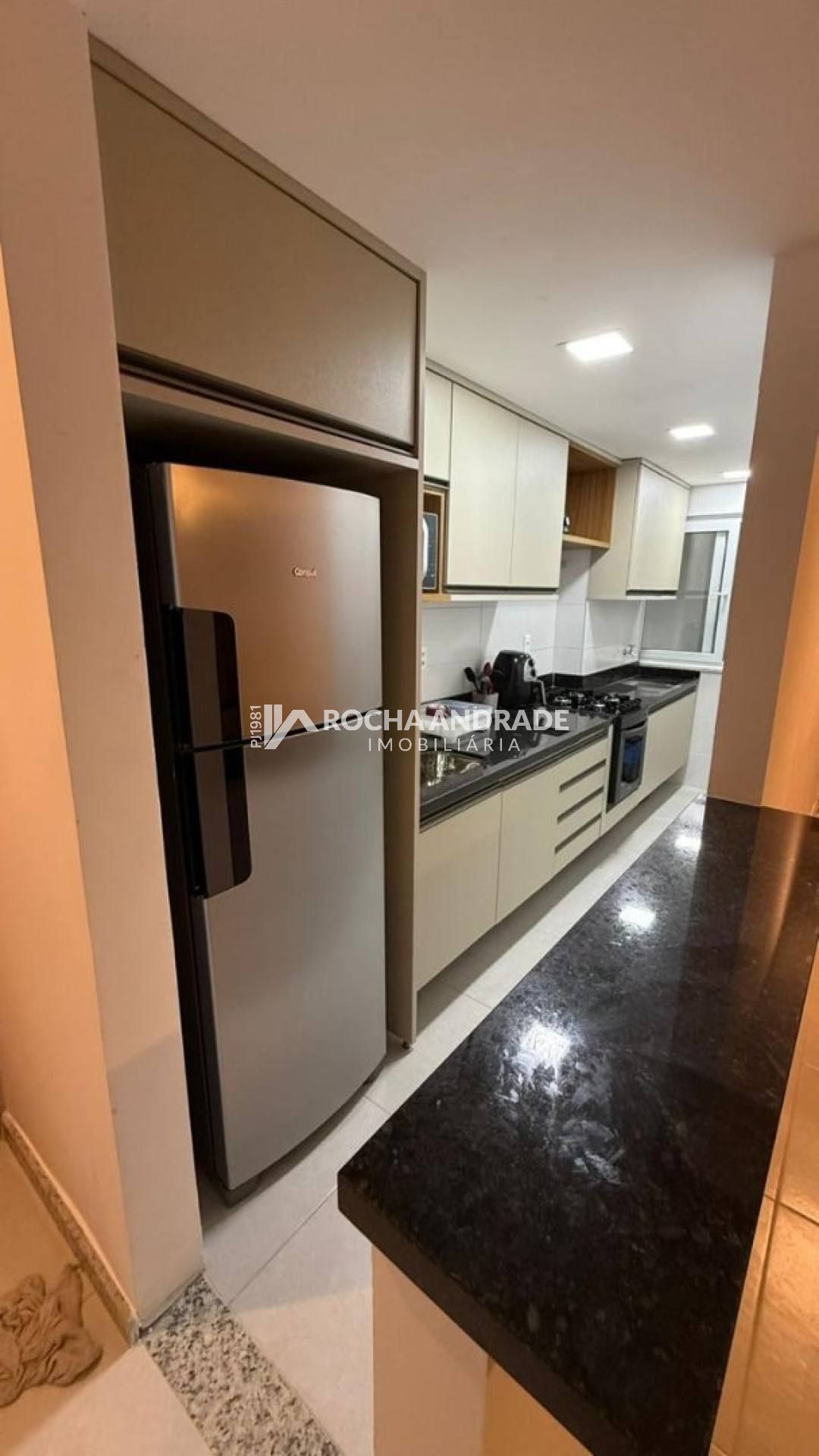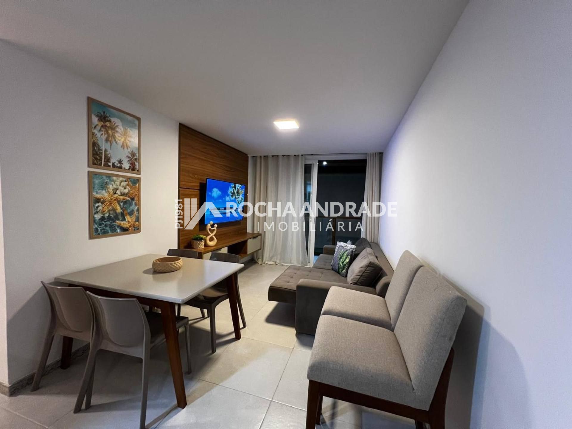 2 quartos, sendo 1 suíte, 1 banheiro social, mobiliado, ar-condicionado, cozinha, sala de jantar, varanda, garagem descoberta.